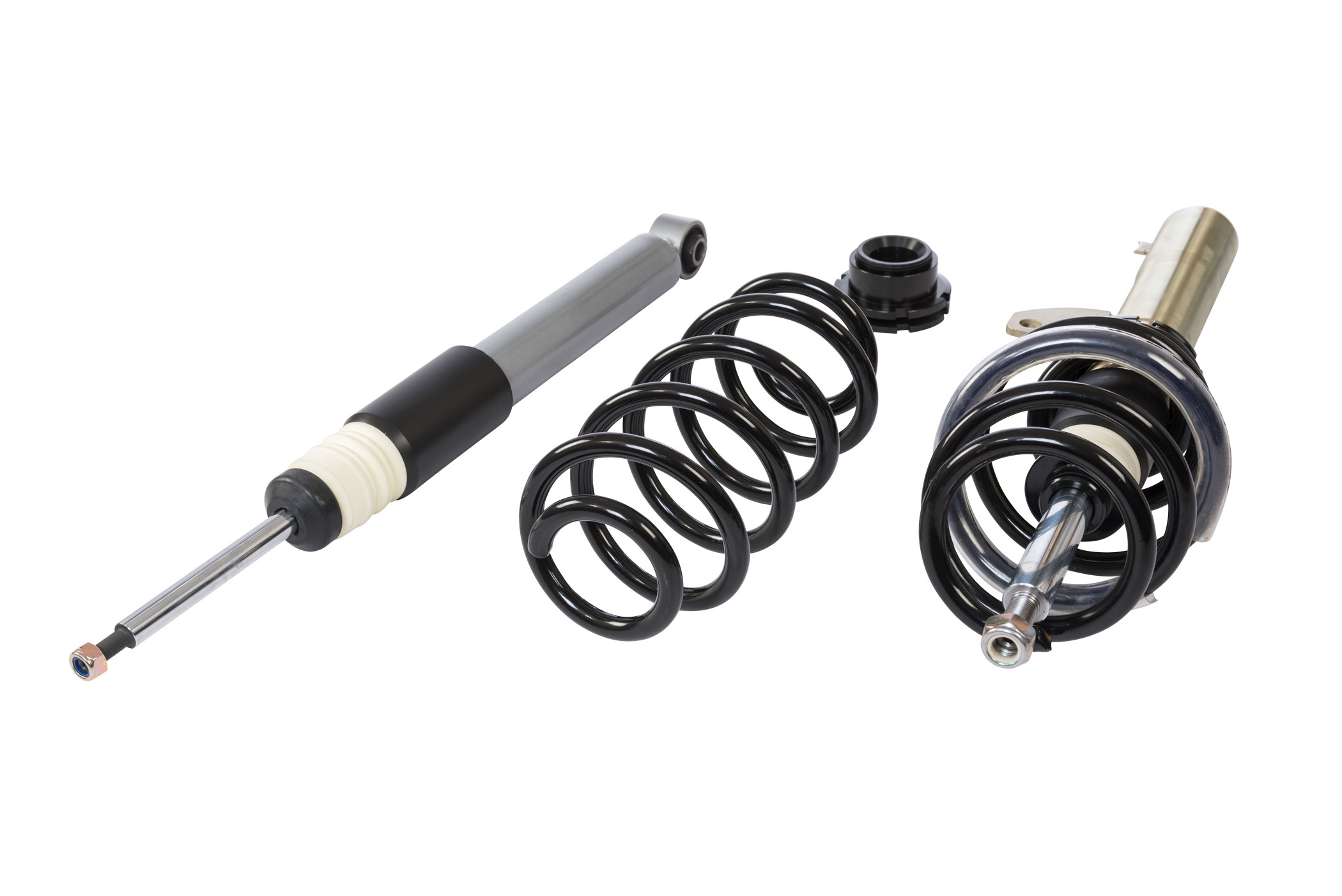 Die mehrfach vergüteten Federn sind durch ihre schwarze Beschichtung in jedem Radhaus ein Hingucker. Auch die verzinkten Federbeine und lackierten Dämpfer halten, wie ein Serienfahrwerk, den unterschiedlichsten Witterungsverhältnissen stand, sowie auch die aus Aluminium gefertigten Federteller und Tieferlegungs - Verstellringe mit ihrer ebenso schwarzen Eloxal - Schicht.