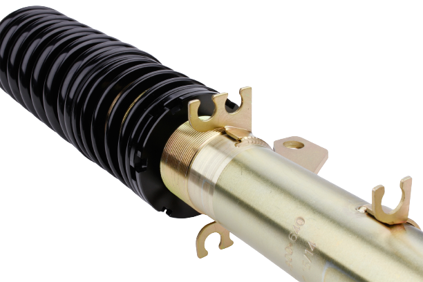 Die mehrfach vergüteten Federn sind durch ihre schwarze Beschichtung in jedem Radhaus ein Hingucker. Auch die verzinkten Federbeine und lackierten Dämpfer halten, wie ein Serienfahrwerk, den unterschiedlichsten Witterungsverhältnissen stand, sowie auch die aus Aluminium gefertigten Federteller und Tieferlegungs - Verstellringe mit ihrer ebenso schwarzen Eloxal - Schicht.