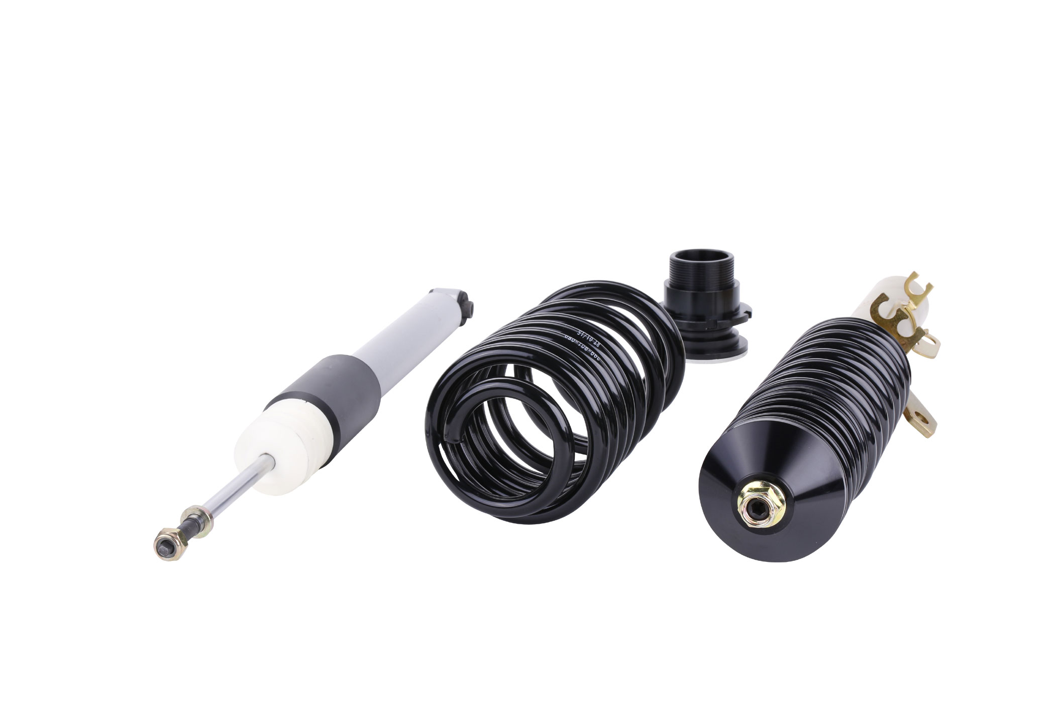 Die mehrfach vergüteten Federn sind durch ihre schwarze Beschichtung in jedem Radhaus ein Hingucker. Auch die verzinkten Federbeine und lackierten Dämpfer halten, wie ein Serienfahrwerk, den unterschiedlichsten Witterungsverhältnissen stand, sowie auch die aus Aluminium gefertigten Federteller und Tieferlegungs - Verstellringe mit ihrer ebenso schwarzen Eloxal - Schicht.