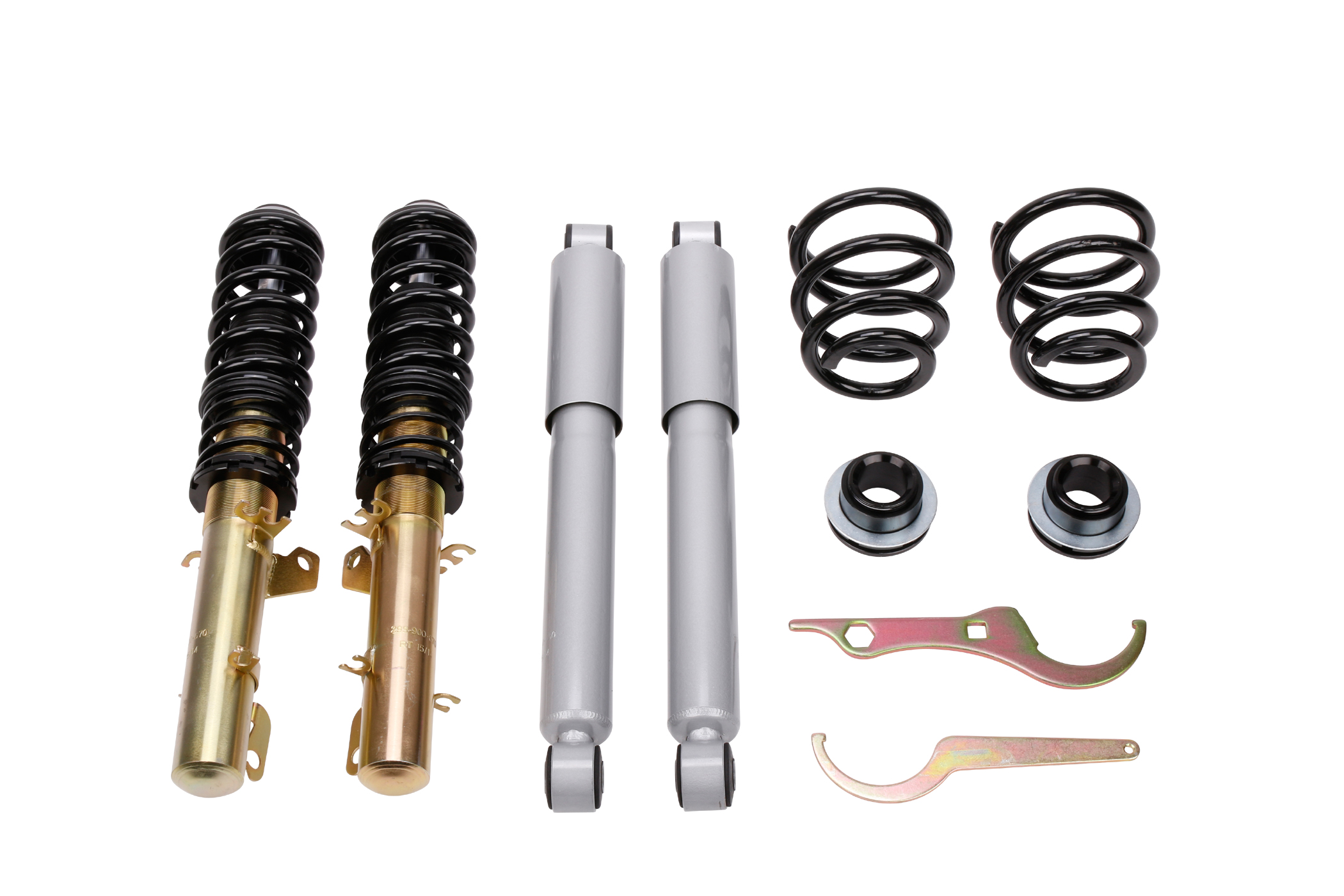 Die mehrfach vergüteten Federn sind durch ihre schwarze Beschichtung in jedem Radhaus ein Hingucker. Auch die verzinkten Federbeine und lackierten Dämpfer halten, wie ein Serienfahrwerk, den unterschiedlichsten Witterungsverhältnissen stand, sowie auch die aus Aluminium gefertigten Federteller und Tieferlegungs - Verstellringe mit ihrer ebenso schwarzen Eloxal - Schicht.